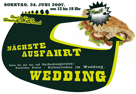 Unter dem Motto „Nächste Ausfahrt Wedding“ werden am Sonntag dem 24. Juni 2007 ungewöhnliche und überraschende Entdeckungstouren durch den Weddinger Kiez ermöglicht.