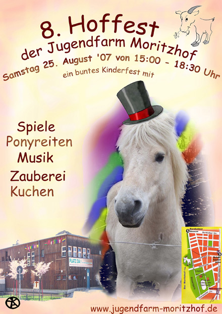 Am Samstag, den 25. August von 15 Uhr bis 18 Uhr gibt es auf der Jugendfarm Moritzhof ein buntes Kinderfest mit Spielen, Ponyreiten, Musik, Zauberei, Kuchen und weiteren kleinen Überraschungen.
