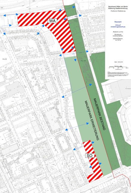 Am 20. Mai 2010 hat die BVV Mitte den Aufstellungsbeschluss für die Weddinger Seite des Mauerparks mehrheitlich verabschiedet. Dieser Beschluss sieht vor, dem jetzt 7,5 Hektar grossen Mauerpark im Bezirk Pankow eine “Parkerweiterungsfläche” von ca. 5,8 Hektar im Wedding hinzuzufügen, sodass der Mauerpark in seiner ursprünglich geplanten Größe fertiggestellt werden kann.