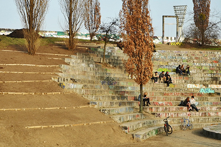 Gerade die starke sommerliche Nutzung des Amphi-Theaters u.a. als Karaoke-Bühne mit tausenden Zuschauern ließ den erst 2008 erneuerten Rasen verschwinden. Besucher, die auf den Stufen keinen Platz mehr fanden, standen also auf dem sensiblen Wiesenrand der Sitzstufen, die spärlichen Reste wurden dann durch folgenden Regen hinweggewaschen bis der Trümmerschutt, auf dem der Hang und das Stadion angelegt wurden zum Vorschein kam.