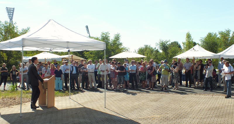 Am 24. Juli vormittags konnte man staunen: statt trennender Eisenzäune laufen Menschen ungehindert von Viertel zu Viertel. Am Parkeingang an der Lortzingstraße stehen Stände der Bürgerwerkstatt, der Freunde des Mauerparks, der Mauergärtner, der Jugendfarm Moritzhof und des Quartiersmanagements Brunnenviertel, um über ihre Aktivitäten zu berichten. Hohe Würdenträger – die Staatssekretäre Gaebler und Gothe von der Stadtentwicklungsbehörde, der zuständige Bezirksstadtrat Spallek von Berlin Mitte und Herr Dr. Spandau, Vorstand der Allianz Umweltstiftung, durchschneiden das obligate rote Band, um die Querverbindung durch den Mauerpark freizugeben. Es werden Reden zur Mauerparkerweiterung geschwungen, auch ein Bürgersprecher trägt sowohl Freude als auch Kritik vor. Durchaus einige Anwohnerinnen und Anwohner komplettieren die morgendliche Runde ebenso wie die Pressevertreter.