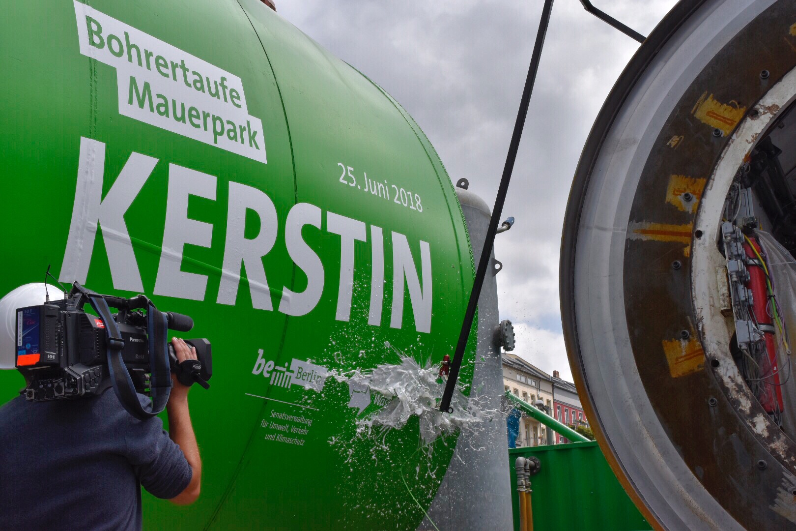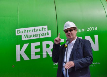 Mit der Taufe der Tunnelbohrmaschine auf den Namen Kerstin startet nun der unterirdische Vortrieb des Stauraumkanals unter dem Mauerpark. Der 654 Meter lange Tunnel unter dem gepflasterten Weg durch den Park soll künftig bei starkem Regen 7.400 Kubikmeter Abwasser speichern und so Panke und Spree vor Verunreinigungen schützen.