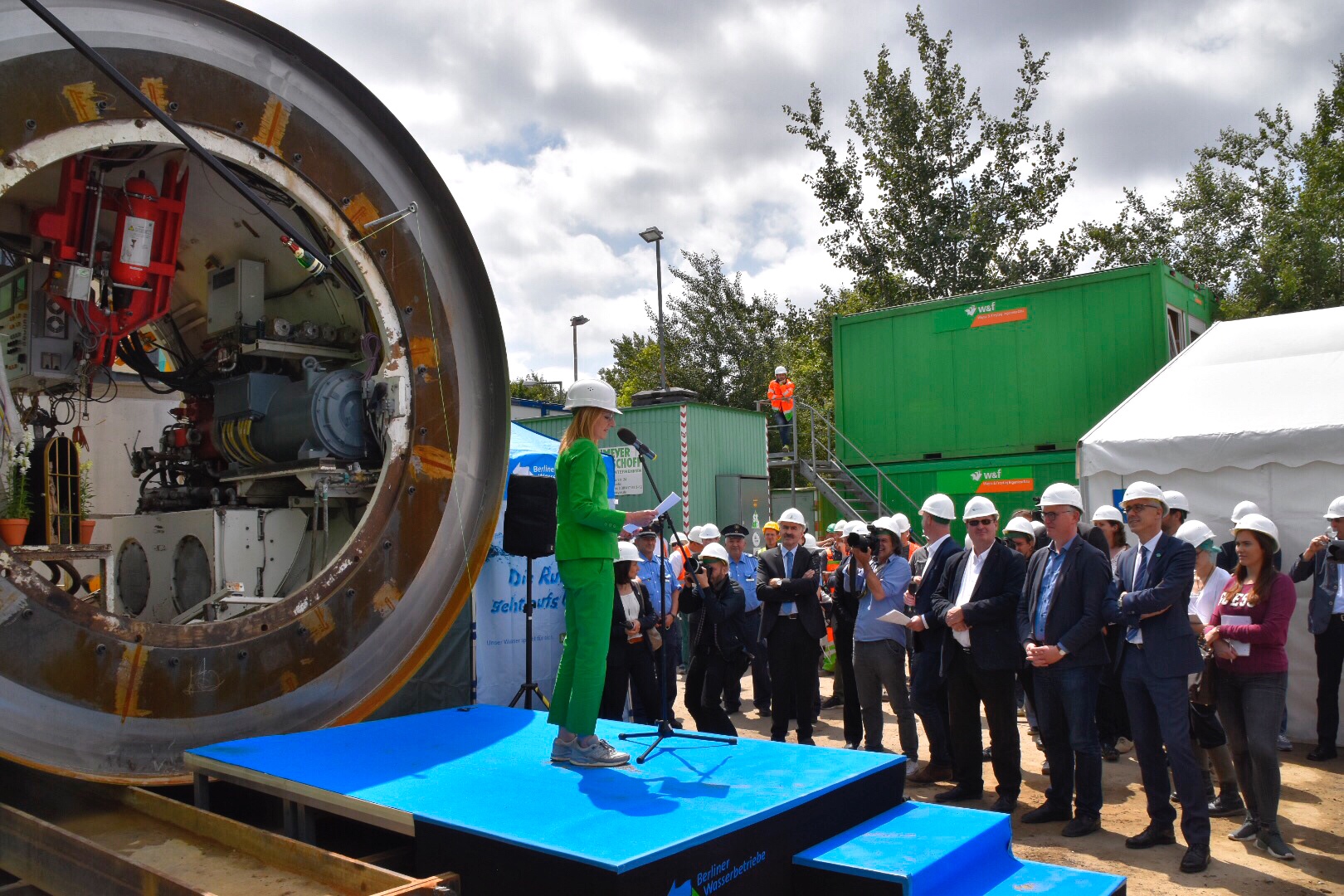Die Tunnelbohrmaschine wurde traditionsgemäß getauft. Namenspatin ist Kerstin Oster, Personalvorständin der Wasserbetriebe, die bei der Taufe um noch mehr Frauen und Mädchen für das innovative Umweltunternehmen warb: „Starke Frauen planen bei uns Projekte wie diesen Stauraumkanal, sanieren Kanäle, leiten Wasserwerke und den gesamten Abwasserbereich. Unsere Aufgaben wachsen und dafür suchen wir ständig Nachwuchs- und Fachkräfte.“