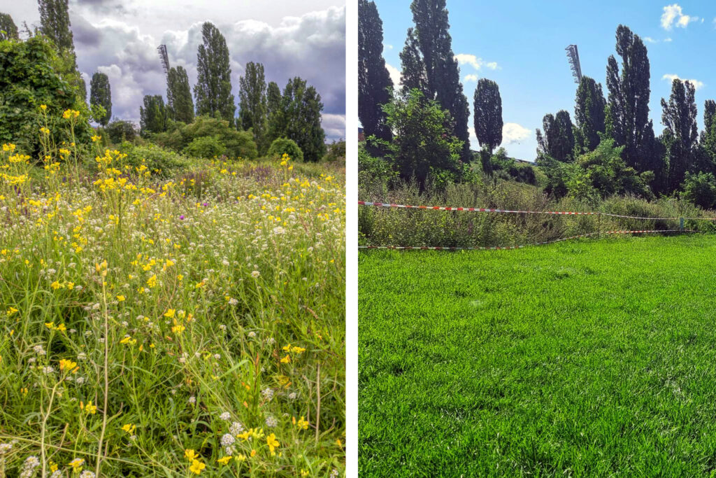 Sogar der bereits als Kompromiss gedachte Erhalt der Wildwiese am Rand der Fläche entlang der Wacholderhecke fiel am Ende (bis auf einen mickrigen Rest) der Bereinigung zum Opfer. Ein herber Rückschlag für die Natur an dieser Stelle, die sich dort trotz hohem Nutzungsdruck ihren Platz erobert hatte. Summa summarum ein trauriges Fazit für die große Rasenfläche!