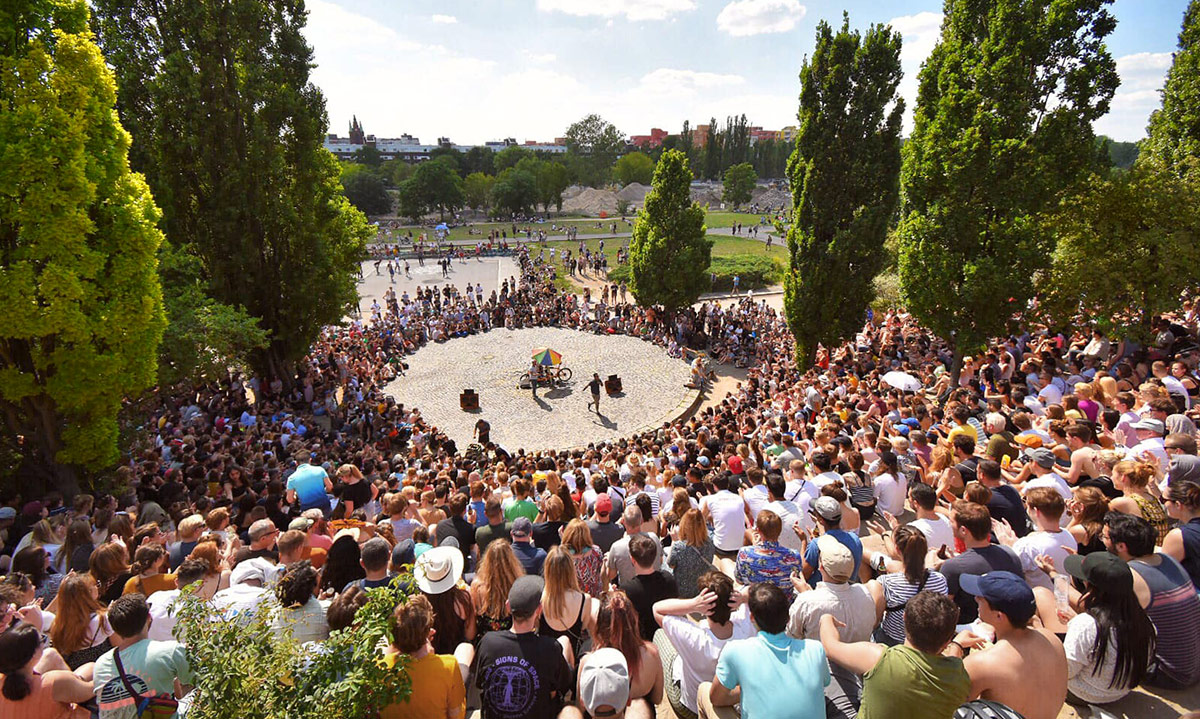 Mauerpark in the summer is, above all, a widely used gathering place for young people and a beloved spot for musicians, jugglers, and bocce, football/soccer and basketball players.